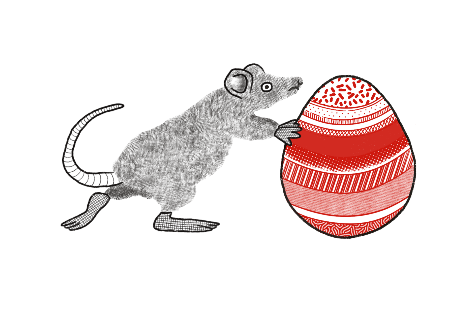 I’m back in bed, and just as I’ve started to doze off, I hear scratching. Another egg rolls under the door. This time, bits of the wrapping have been nibbled off.